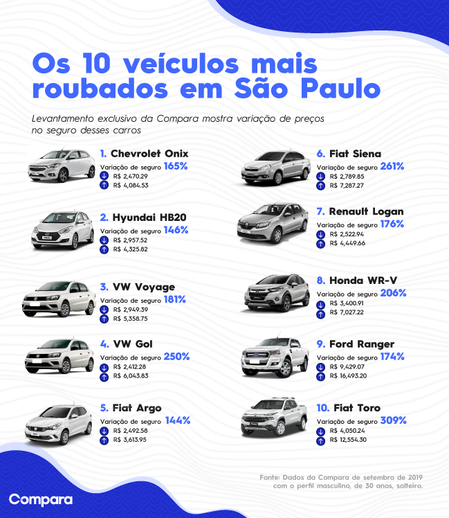 Por isso, um segmento que é muito afetado é o de seguro auto. Pensando em analisar este cenário, foi feito um levantamento dos valores dos seguros dos dez veículos mais visados na cidade. E a diferença é impressionante: no Fiat Toro, décimo colocado na lista dos mais roubados, a variação chega até 309%.