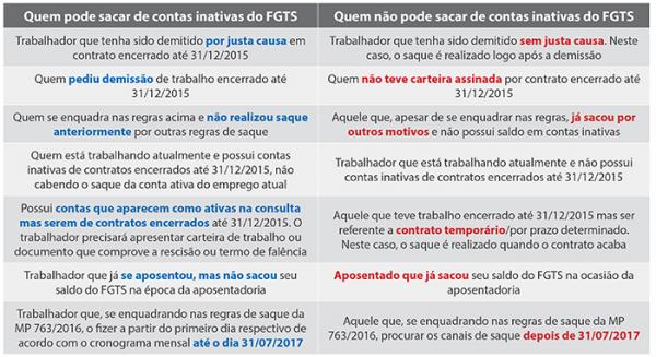 O anúncio da possibilidade do trabalhador movimentar as contas inativas foi feito em dezembro do ano passado. Pelas novas regras, pode efetuar o saque quem teve contratos de trabalho finalizados até 31 de dezembro de 2015 e tenha saldo na conta. O pagamento das 49,6 milhões de contas inativas seguirá um calendário específico que leva em conta o mês de aniversário do trabalhador. A expectativa do governo é que, ao resgatar o dinheiro parado, os trabalhadores injetem mais de R$ 30 bilhões na economia.