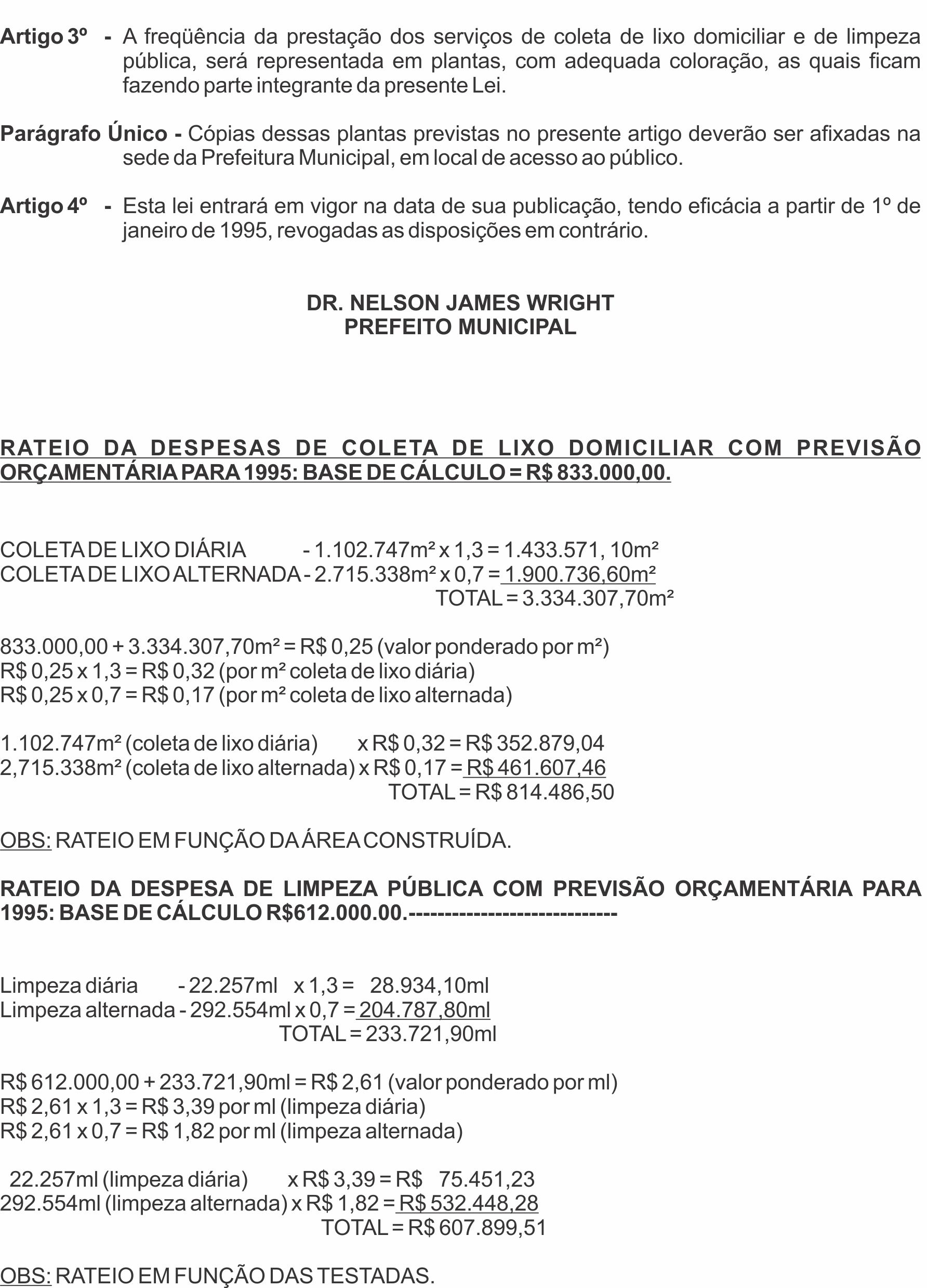 Segundo a lei, 85% das despesas seriam rateadas entre a população. Naquela época, a previsão do custo com coleta de lixo era de R$ 833 mil e com limpeza pública de R$ 612 mil. Nos locais com coleta diária de lixo, um imóvel com 240 metros quadrados pagava R$ 78,00 (em valores corrigidos pelo INPC, o valor atual seria de R$ 381,16). Já nos bairros com coleta alternada para um imóvel do mesmo tamanho, o preço seria de R$ 42,00 (ou, R$ 205,24 nos valores atuais).