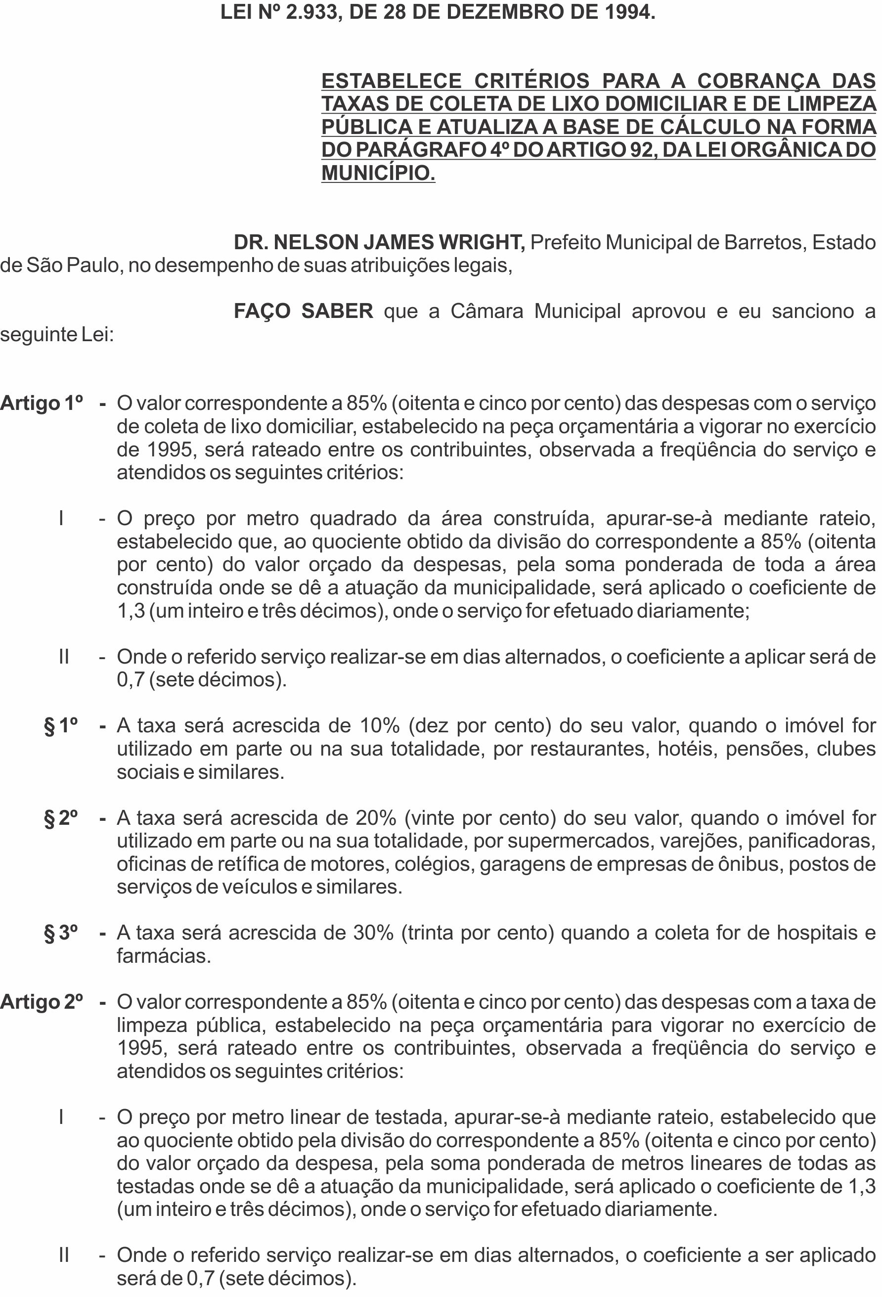 A taxa de coleta de lixo domiciliar e de limpeza pública existe em Barretos há 23 anos. A lei 2.933 de 28 de dezembro de 1994 foi sancionada pelo então prefeito Nelson James Wright.