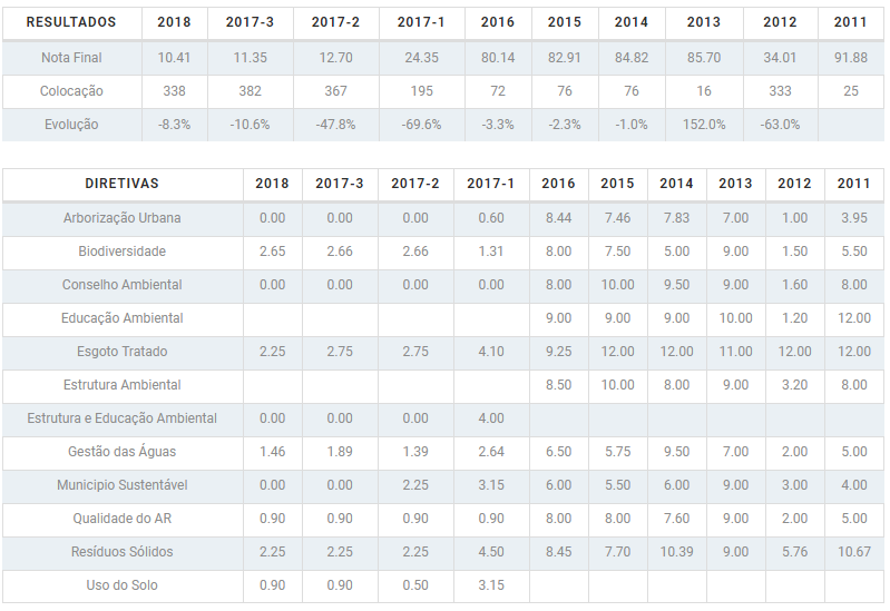 Para a composição das notas, que vão de 0 a 10, são levadas em consideração dez aspectos: arborização urbana, biodiversidade, conselho ambiental, educação ambiental, esgoto tratado, estrutura ambiental, estrutura e educação ambiental, gestão das águas, município sustentável, qualidade do ar, resíduos sólidos e uso do solo.