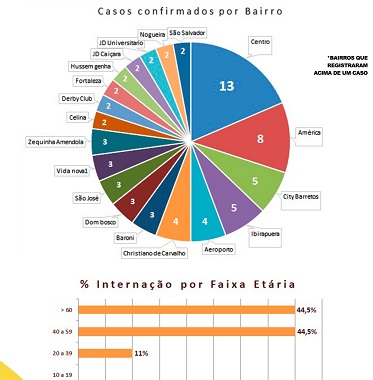 O levantamento dos casos por região da Cidade apontou que o Centro é o local em que houve mais incidência de casos. Entre os 108 registros confirmados da Covid-19 até o dia 7 de maio, 13 eram em moradores do Centro da cidade, oito do Bairro América, cinco do City Barretos e cinco do Ibirapuera. Outros 15 bairros apresentam, pelo menos, dois casos confirmados da pandemia. Os outros 38 casos são de moradores de outras localidades espalhados pela cidade, que apresentavam um único caso por bairro até o momento da análise.