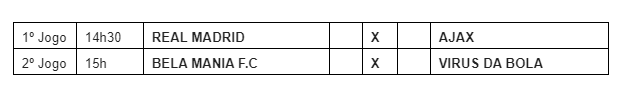 No ginásio do Conjunto Poliesportivo Municipal “João Batista da Rocha” – Rochão, o Vírus da Bola passou pelo Medicina por 3 x 0. Estão classificados para a semifinal, Real Madrid, Vírus da Bola, Ajax e Bela Mania. Os jogos acontecem no próximo sábado (5), no Cemepe do Bairro Pimenta.