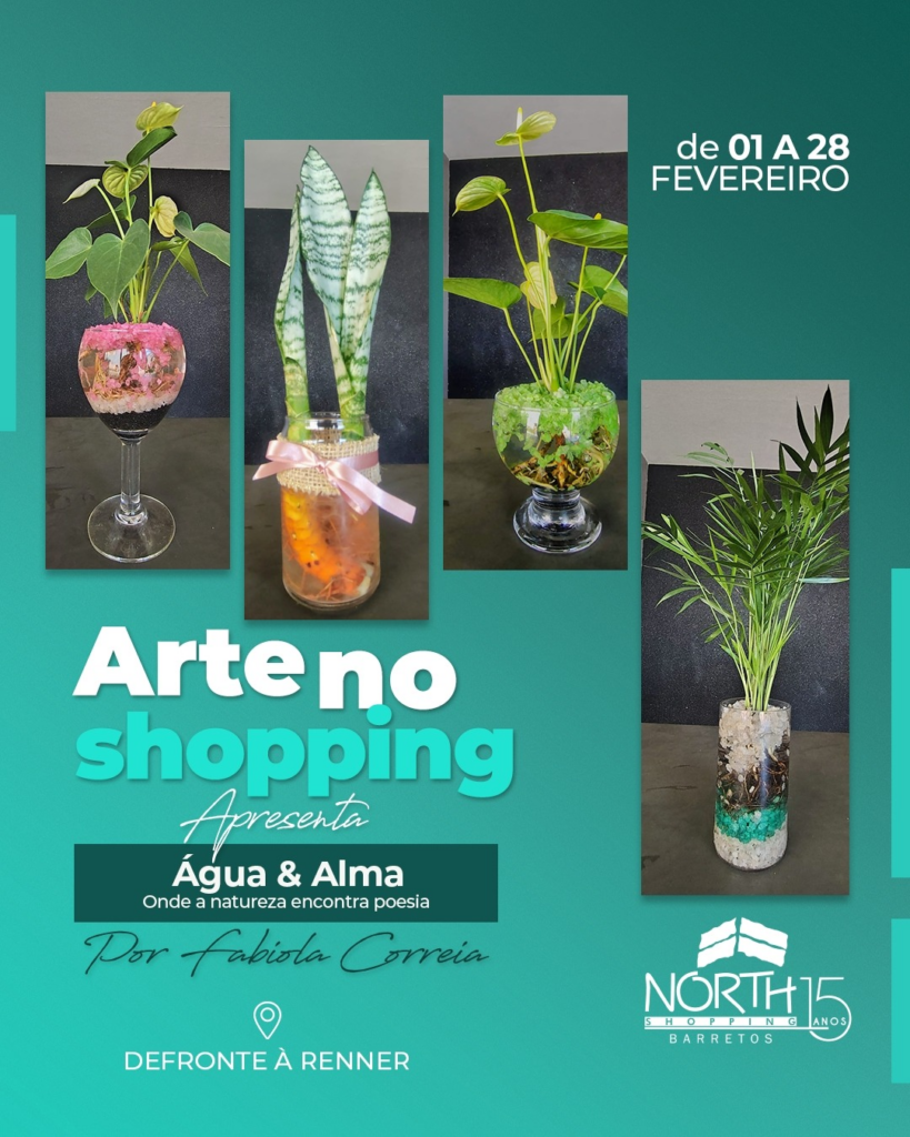 O North Shopping Barretos recebe, até o dia 28 de fevereiro, a edição do mês do projeto Arte no Shopping, com a exposição da Água & Alma Hidroponia, assinada pela jornalista Fabíola Correia. A mostra reúne arranjos exclusivos de plantas cultivadas por meio da técnica de hidroponia e está aberta para visitação e compras no espaço ao lado da Dona Flor.