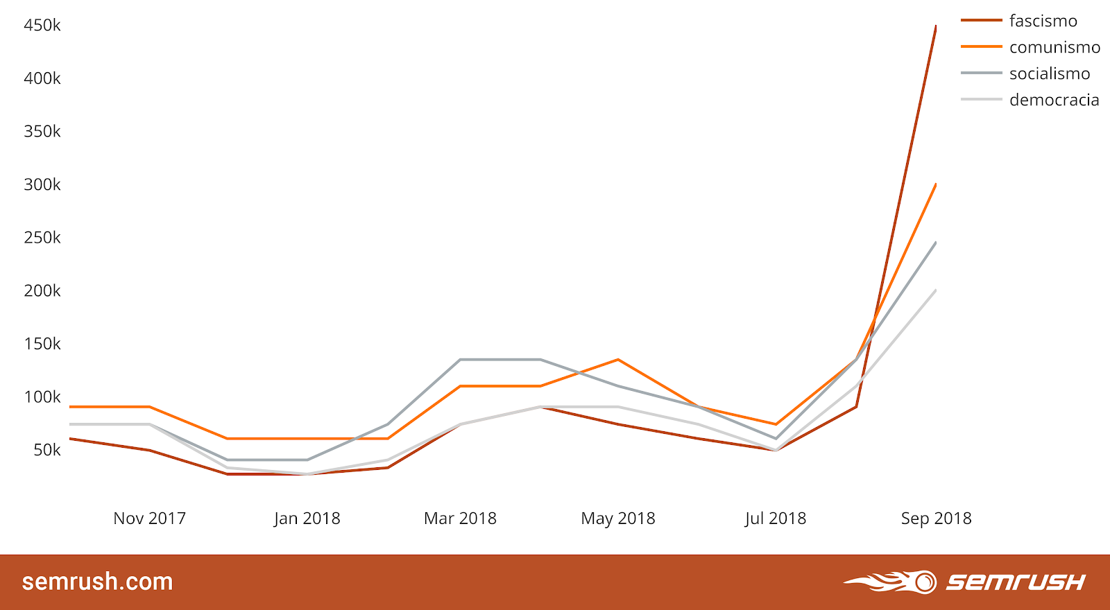 O termo fascismo foi o campeão: as buscas cresceram 643% em 12 meses. Em outubro de 2017 eram 60,5 mil buscas mensais, enquanto no mesmo período de 2018 foram 450 mil. Comunismo e socialismo também tiveram alta nas buscas, com 232% de aumento no último ano. Já o sistema político vigente no Brasil, a democracia, é a que menos possui crescimento nas buscas, com aproximadamente 171%. Esses dados são fundamentais para entender o comportamento dos eleitores, já que muitos optam por pesquisar conceitos que podem interferir diretamente no resultado e consequências da eleição.