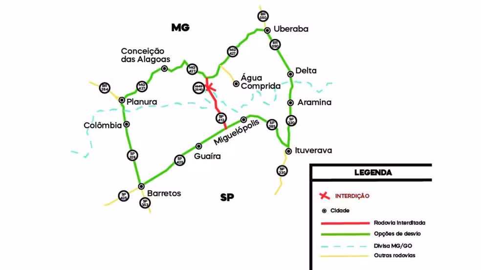 A ponte da Volta Grande, sobre o Rio Grande, que liga os municípios de Conceição das Alagoas e Miguelópolis, passou de restrição parcial de tráfego para interdição total. A mudança de cenário ocorreu após novas vistorias técnicas apontarem risco estrutural, levando órgãos de Minas Gerais e São Paulo a adotarem o bloqueio preventivo da travessia a partir da noite de quinta-feira (5).