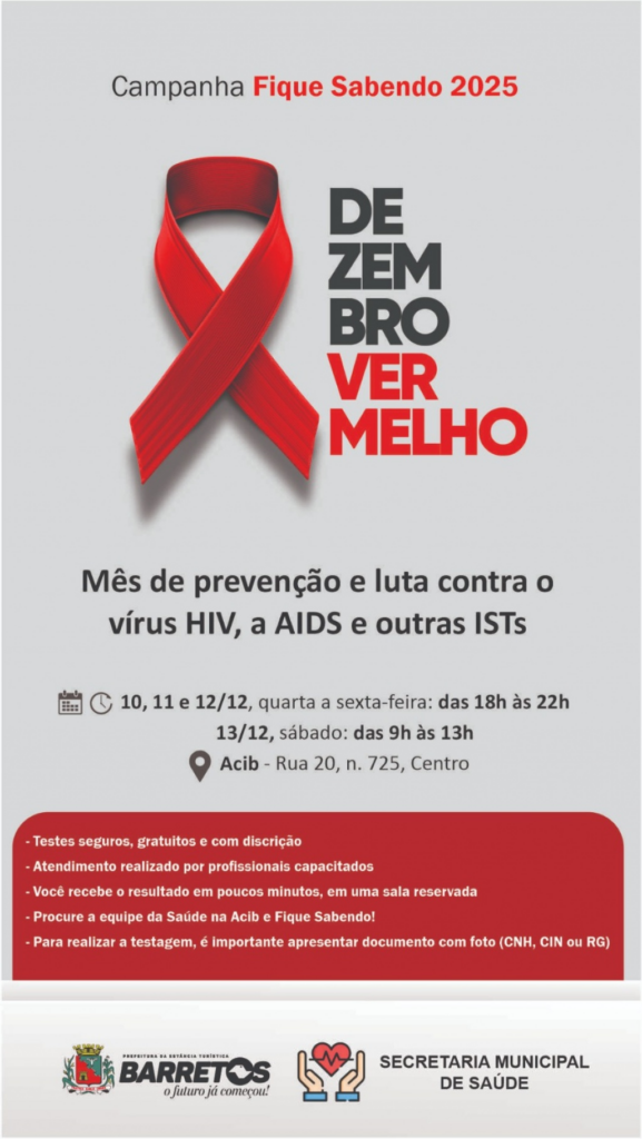 A Campanha Fique Sabendo 2025 continua sendo realizada nesta semana na sede da Acib, no centro de Barretos, com testagens para HIV, sífilis e hepatites B e C. Os atendimentos seguem até sexta-feira (12), das 18h às 22h, e no sábado (13), das 9h às 13h.