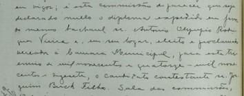 Transcrição de trecho da ata “[…] é esta Comissão de parecer que seja declarado nulo o diploma expedido em favor do mesmo bacharel sr. Antônio Olympio Rodrigues Vieira e, em seu lugar, eleito e proclamado vereador à Câmara Municipal, para este triênio de mil novecentos e quatorze – mil novecentos e dezessete, o candidato contestante sr. Joaquim Buck Filho, Sala das Comissões […]”